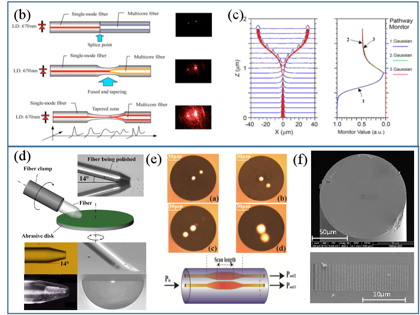 团队提出了一种在光纤内部进行器件与光路集成的新方法,利用独有的组棒或超声打孔技术制备预制棒,研制了数十种具有独立知识产权的多芯微结构光纤,再经过耦合拉锥、激光刻写等技术对其内部或外部的微加工技术,发现同一光纤中多个波导进行组合与互连可以实现纤内光路集成;