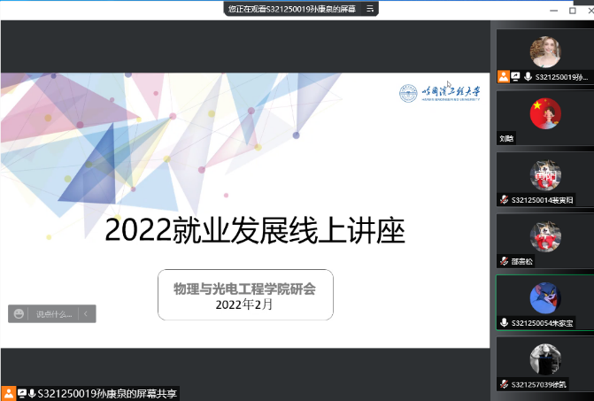 2月28日,tyc7111cc太阳成集团研究生会举办了2022就业发展线上讲座活动。本次活动由tyc7111cc太阳成集团研究生会组织,邀请辅导员老师主讲生涯规划基本知识,首先从如何认识自我、突破自我,如何规划适合自己的成才路径,并与同学们互动,最后同学们交流自己的心得。同学们听讲认真,互动积极,对职业发展有了自己的一定规划。