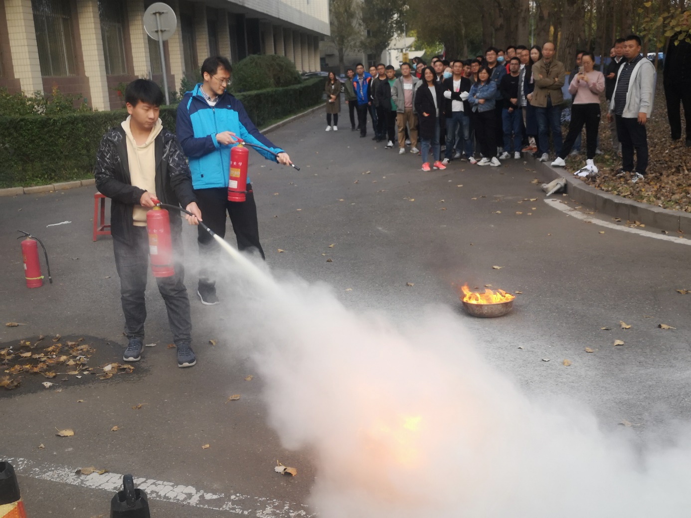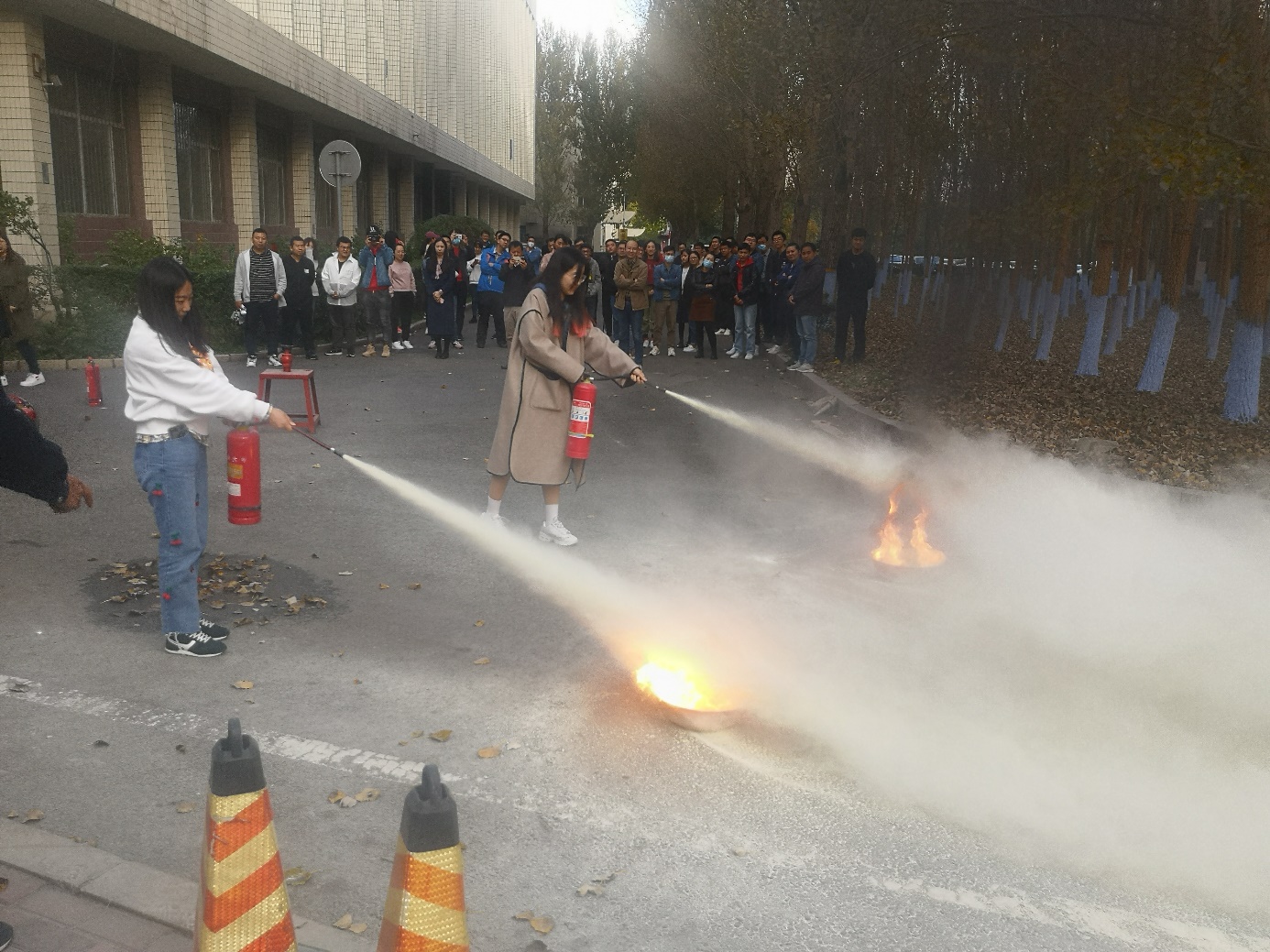 应急疏散演练后,防火科老师为大家详细讲解了灭火器的种类、使用方法及灭火要点,并亲自进行了示范操作。随后演练在校园内的一片空地上展开,根据安排,师生依次拿起灭火器,走到火源前,拔栓、对准、灭火,通过实战化的演练使参演人员掌握了灭火器的使用和扑灭初起火灾的方法。