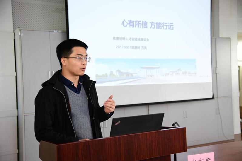 2017级的方亮同学讲述了自己在陈赓班学习期间,在老师的鼓励和帮助下,借助学校、学院优质的创新环境,成功实现了自己的科创梦想。在他看来,创新可以用“灵光一现、步步为营、迭代创新、一念非凡”四个词来概括。就是要有好的创新想法,驰而不息的奋斗状态,在与现实环境的持续交互过程中,不断砥砺前行,最终成为源头式创新、颠覆式创新。