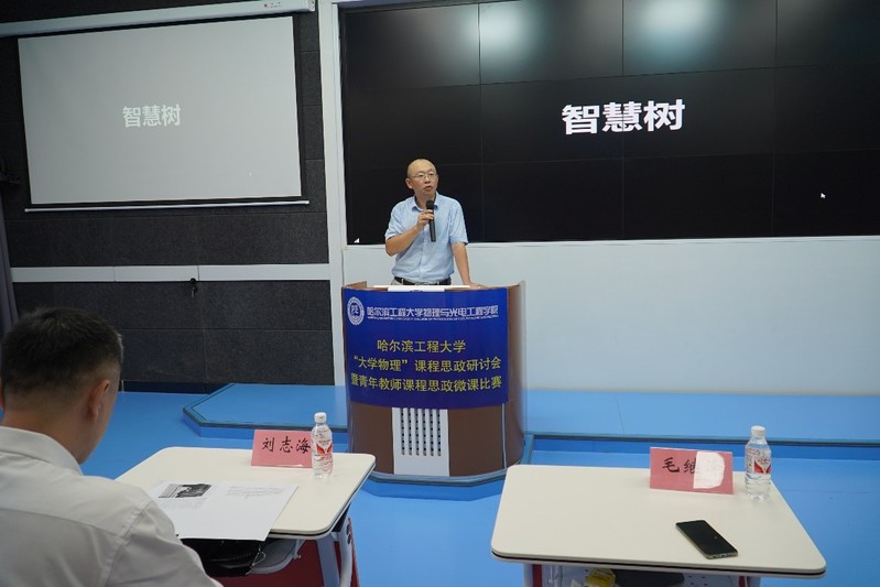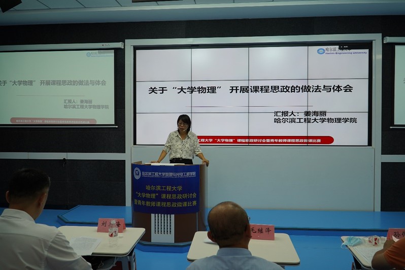 第二环节:青年教师课程思政微课比赛。来自大学物理课程的8位青年教师参加了本次微课比赛,各位教师充分挖掘专业知识中的思政元素,将之有机融入到专业知识中,为后续开展课程思政建设起到了很好的引领作用。经过专家现场评比,刘艳磊教师获得一等奖。