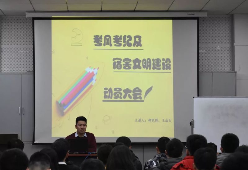 对于考风考纪和寝室文化建设,首先由王法天老师讲解新出台的相关政策文件,强调学校对于考风考纪的重视,明确违规行为的相应处分,情节严重者可直接开除学籍。之后邵光辉老师讲解寝室文明建设的重要性,例举了一些典型的寝室卫生问题及其解决办法,提醒同学们重视寝室卫生与个人健康的关系。