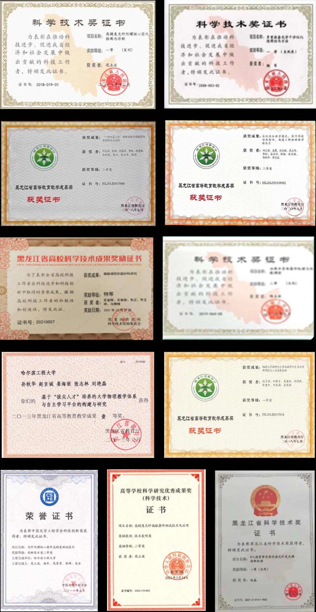 2013年黑龙江省高等教育教学成果一等奖2014省科学技术进步奖一等奖1项2014省自然科学二等奖1项2014省自然科学三等奖1项2014省高校科学技术二等奖2项2015第十二届黑龙江省青年科技奖1项2016中国光学工程学会科技创新奖1项2017教育部技术发明二等奖2018省技术发明一等奖1项2018年黑龙江省高等教育教学成果一等奖2018年黑龙江省高等教育教学成果二等奖2019省科技奖二等奖1项2020省自然科学二等奖1项2020年黑龙江省高等教育教学成果二等奖2021省自然科学一等奖1项